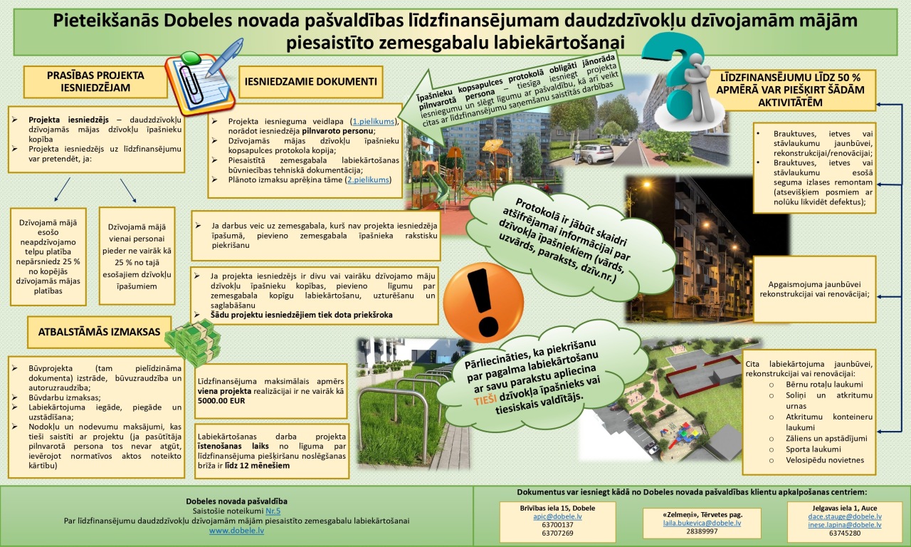 Dobeles novada pašvaldība izsludina projektu iesniegšanas II kārtu, lai pretendētu uz līdzfinansējumu daudzdzīvokļu dzīvojamām mājām piesaistīto zemesgabalu labiekārtošanai atbilstoši Dobeles novada pašvaldības saistošo noteikumu Nr.5 prasībām.