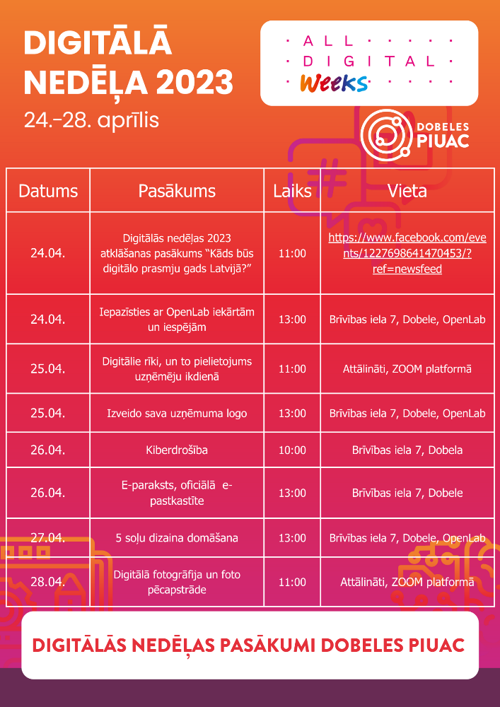 Digitālās nedēļas pasākumu koordinators Dobeles novadā ir Dobeles Pieaugušo izglītības un uzņēmējdarbības atbalsta centrs.