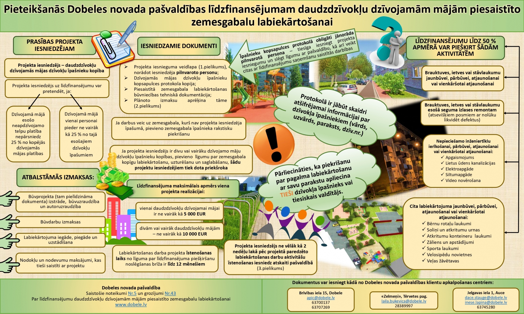 Plašāka informācija – Dobeles novada pašvaldības 24.11.2022. saistošie noteikumi Nr.43 “Grozījumi Dobeles novada domes 2022.gada 27.janvāra saistošajos noteikumos Nr.5 “Par līdzfinansējumu daudzdzīvokļu dzīvojamām mājām piesaistīto zemesgabalu labiekārtošanai”” un infografikā.